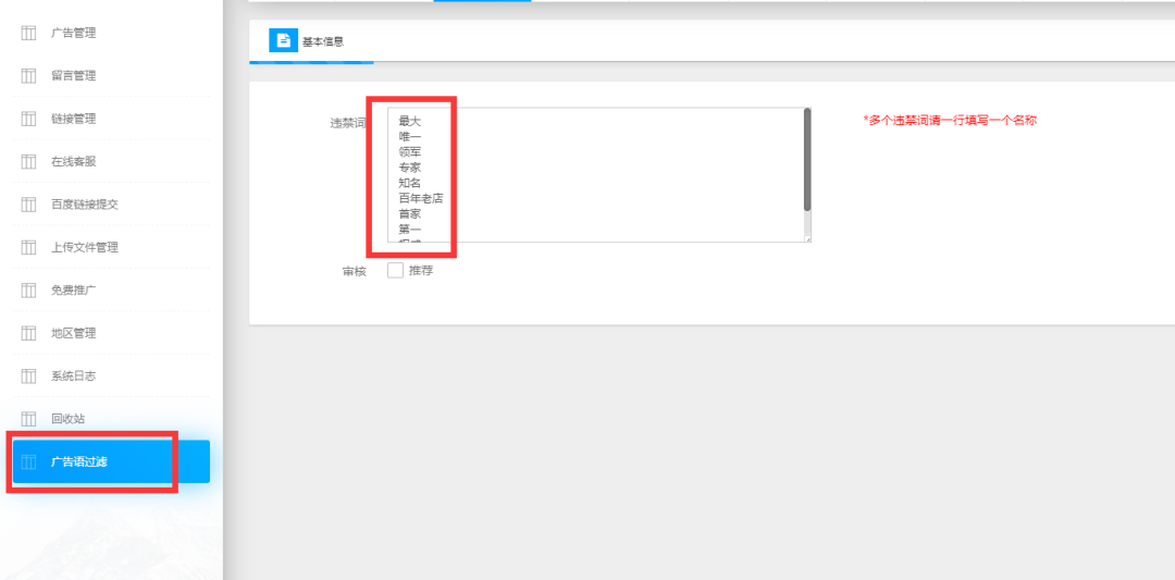 廣告法規(guī)定越來越嚴(yán)格,廣告詞成了企業(yè)的不敢碰觸的“炸彈”。對此,此次“萬家燈火CMS系統(tǒng)”的升級,可在編輯框中自定義自己領(lǐng)域中的違禁詞,讓網(wǎng)站遠(yuǎn)離“危險”*。