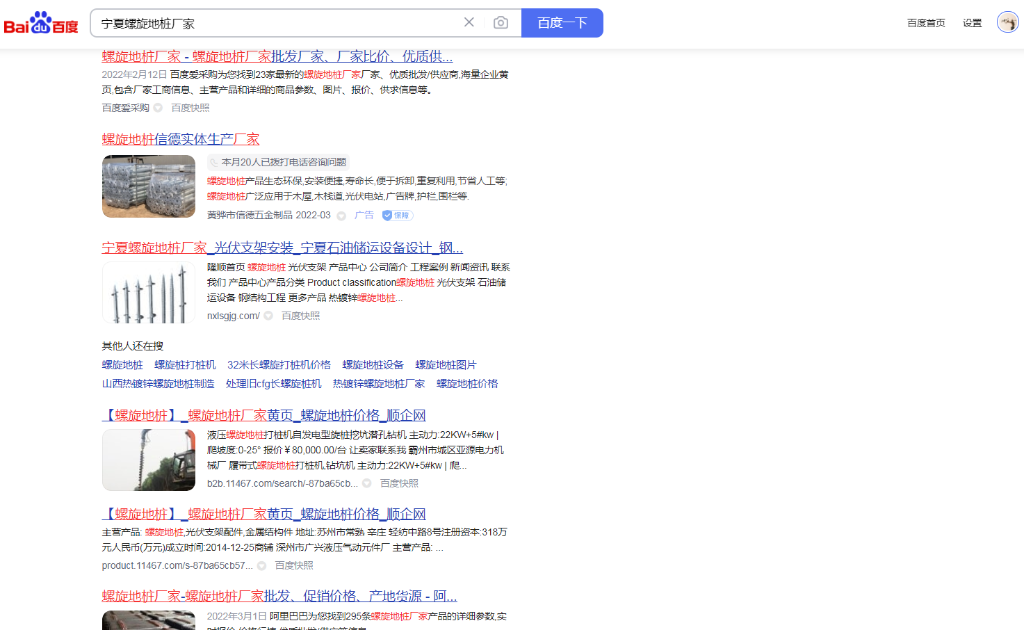 3官網(wǎng)優(yōu)化:寧夏螺旋地樁廠家、寧夏光伏支架安裝、寧夏石油儲運設備設計等關鍵詞均在百度首頁展現(xiàn),投放至今搜索效果明顯。