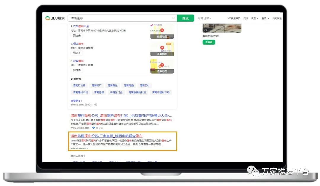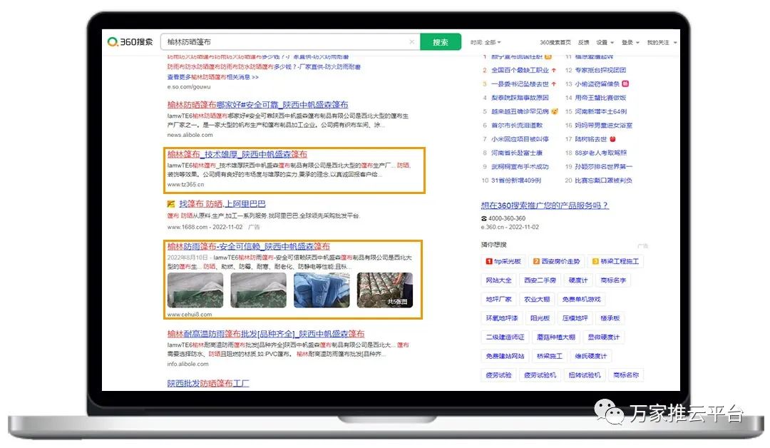 >>>B2B商盟:銅川篷布價位、榆林防曬篷布等關(guān)鍵詞均在360搜索引擎平臺首頁展現(xiàn)。