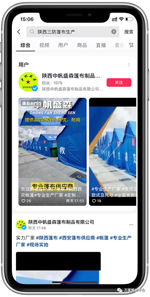 >>>視頻:策劃剪輯發(fā)布多條視頻,咸陽三防篷布廠商、陜西三防篷布生產(chǎn)等關(guān)鍵詞均在抖音搜索前列展現(xiàn)。